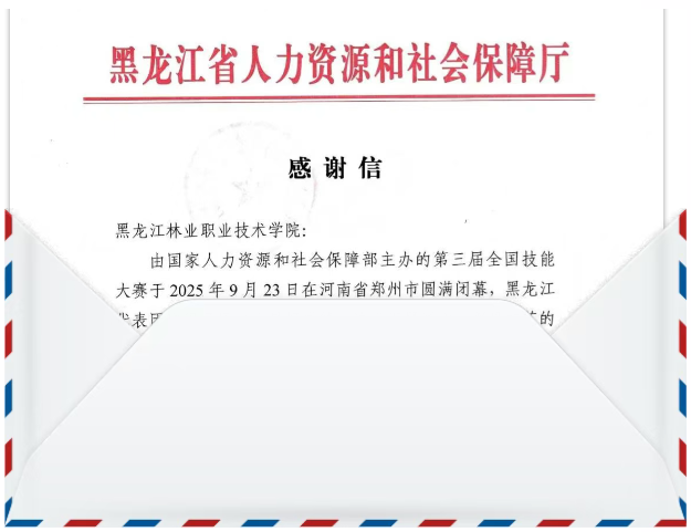 近日,黑龙江省人力资源和社会保障厅向学院发来感谢信,热烈祝贺学院在第三届全国技能大赛中取得佳绩,并衷心感谢为此付出辛勤努力的全体师生。同时,信函也高度评价了学院在人才培养、产教融合方面取得的卓越成效。