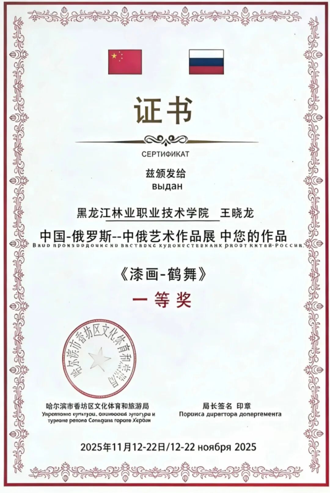 近日,由哈尔滨市香坊区人民政府、香坊区文化体育和旅游局主办的2025年首届中俄艺术作品展在哈尔滨圆满落幕。学院城市建设系教师王晓龙的漆画作品《漆画-鹤舞》荣获展览一等奖。