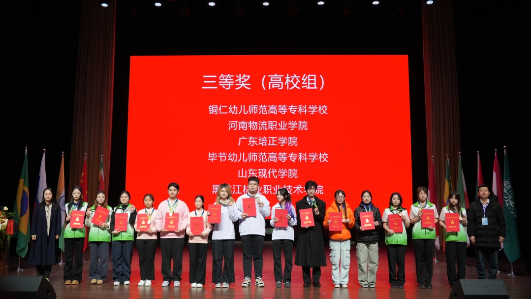 近日,2025年“一带一路”暨金砖国家技能发展与技术创新大赛——中文+职业综合技能(普通话)赛项决赛在安徽合肥圆满落幕。由人文系韩雪、张亚男担任指导教师,学前教育专业学生武雨欣、张佳莉、丁韩组成的学院代表队表现优异,荣获大赛三等奖。
