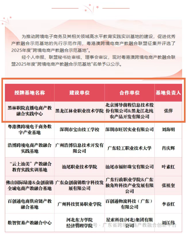 近日,粤港澳跨境电商产教融合联盟2025年度“跨境电商产教融合示范基地”评选结果正式公布。学院电子商务专业申报的“黑林职院直播电商产教融合实践中心”成功入选,是黑龙江省唯一入选单位。