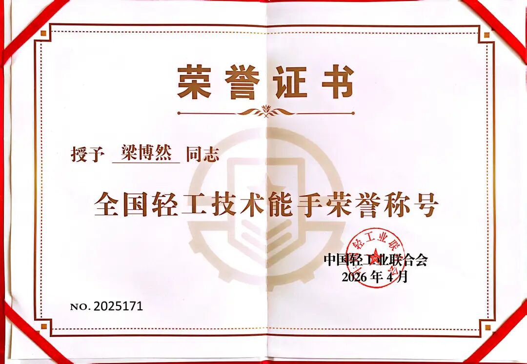 4月2日,2026年全国行业职业技能竞赛——第七届轻工大赛动员大会在江西南昌召开。会议对在第三届全国技能大赛轻工领域取得优异成绩的选手进行了集中表彰。学院世赛基地选手梁博然凭借在赛中的优异表现,被授予“全国轻工技术能手”荣誉称号。