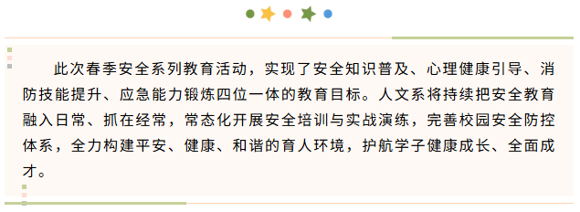 春季学期开学以来,人文系聚焦安全教育、心理健康、消防安全、防校园欺凌等内容,系统开展主题班会、消防器械实操演练、防火应急演练等系列安全教育活动,全力筑牢校园安全屏障。