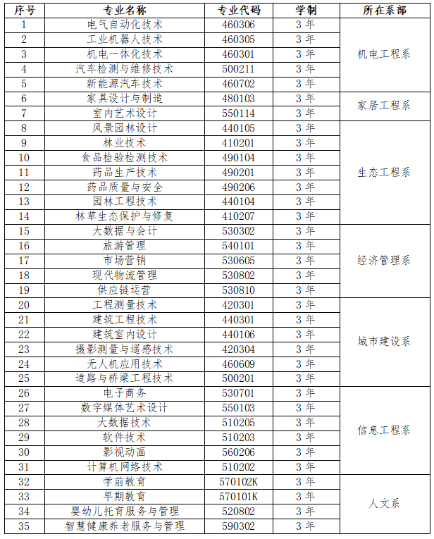 说明:新增林草生态保护与修复、数字媒体艺术设计2个专业,撤销工商企业管理专业,停招酒店管理与数字化运营、空中乘务、园林技术、广告艺术设计4个专业,2025年实际招生3年制高职专业共计35个。